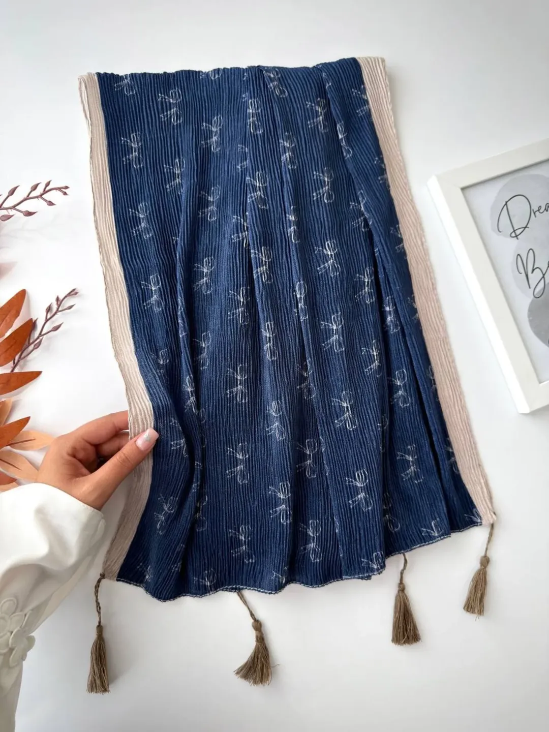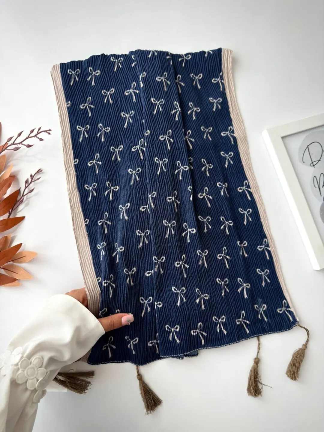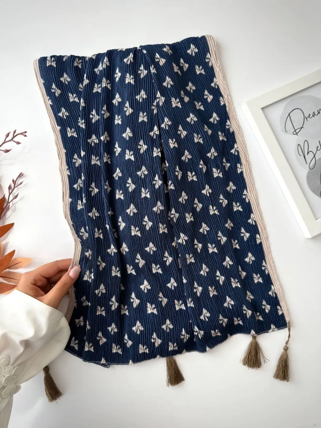 شال نخی پلیسه تک رنگ سورمه با انواع طرح های پاپیونی سفید و کرم و منگوله دار
