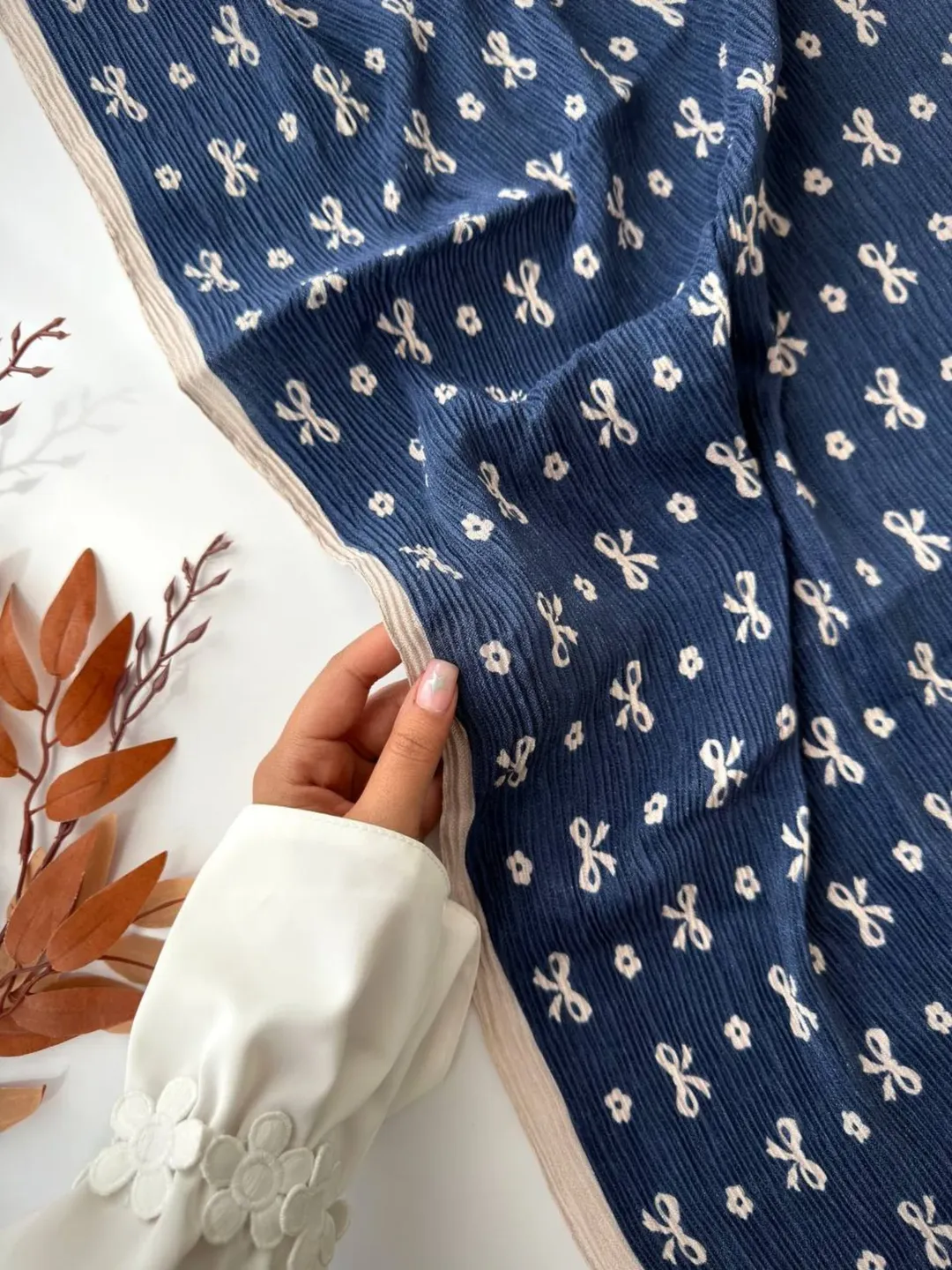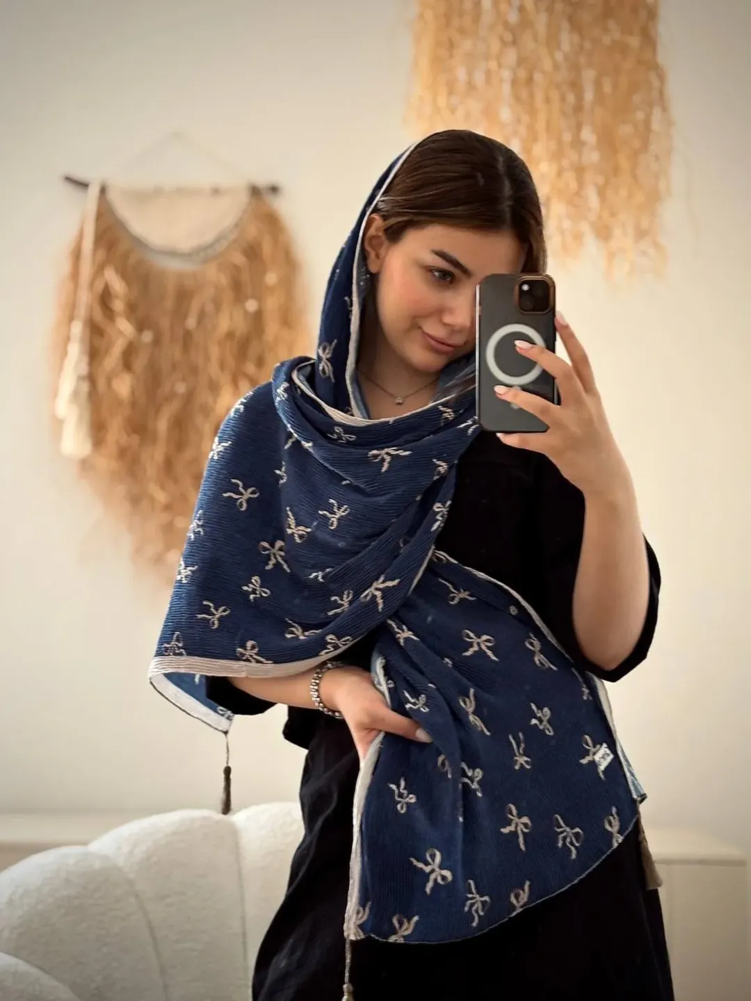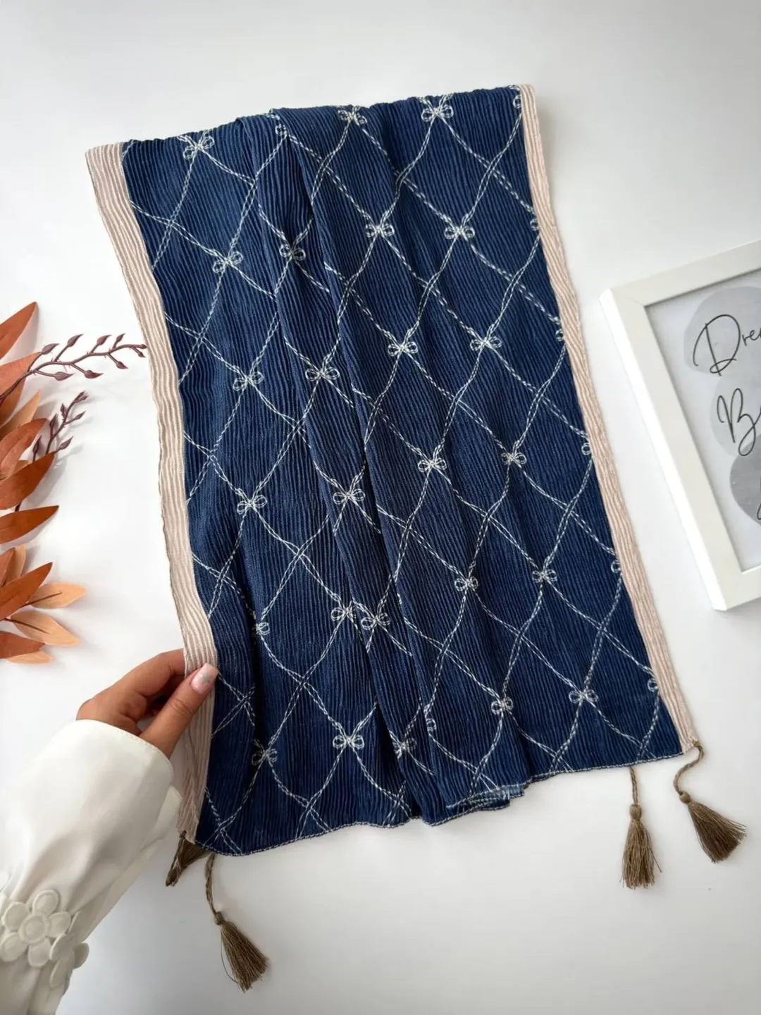شال نخی پلیسه تک رنگ سورمه با انواع طرح های پاپیونی سفید و کرم و منگوله دار