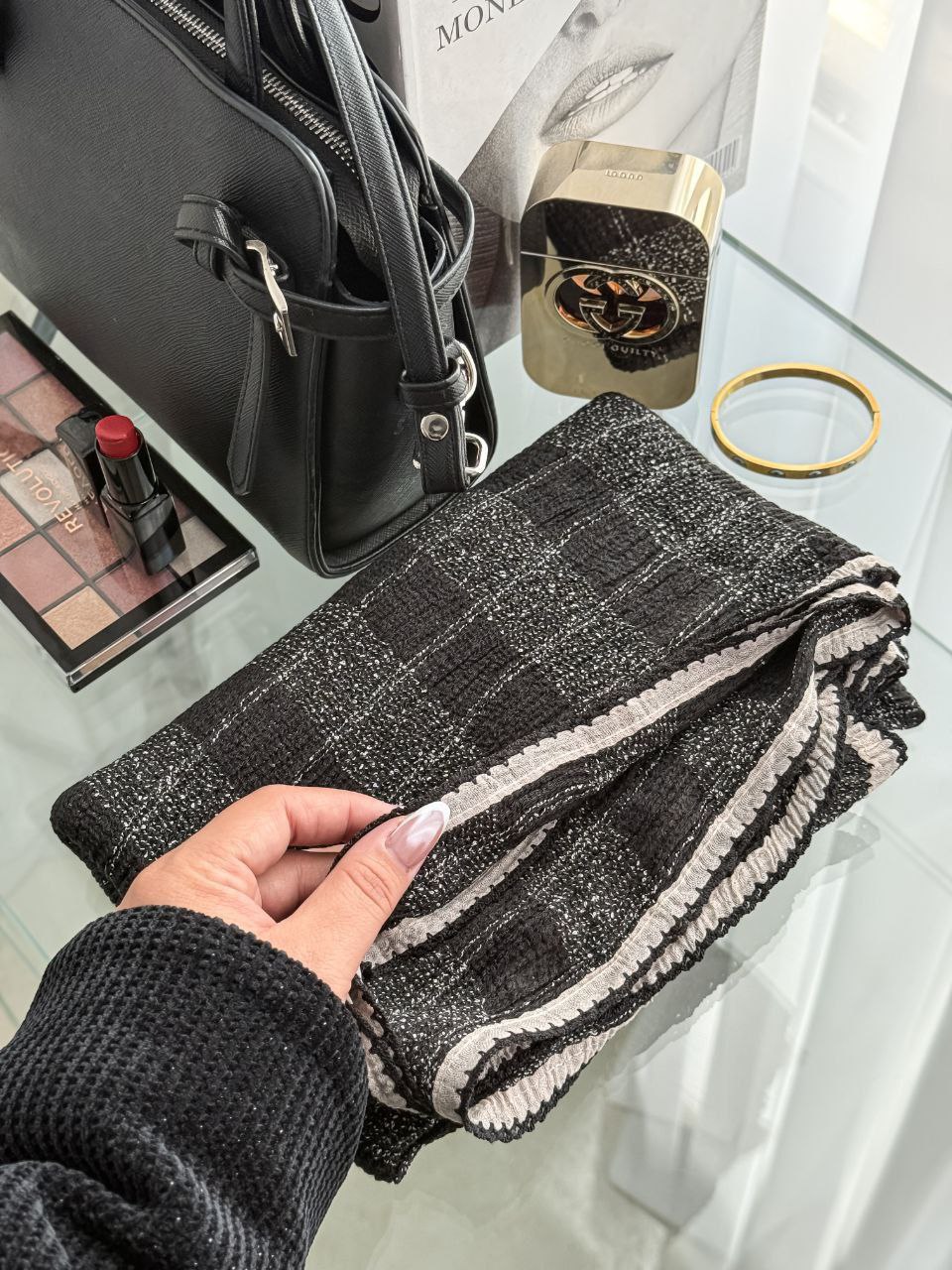 شال مشکی لمه دار وارداتی طرح‌بندی نخ بروشکا پاییزه